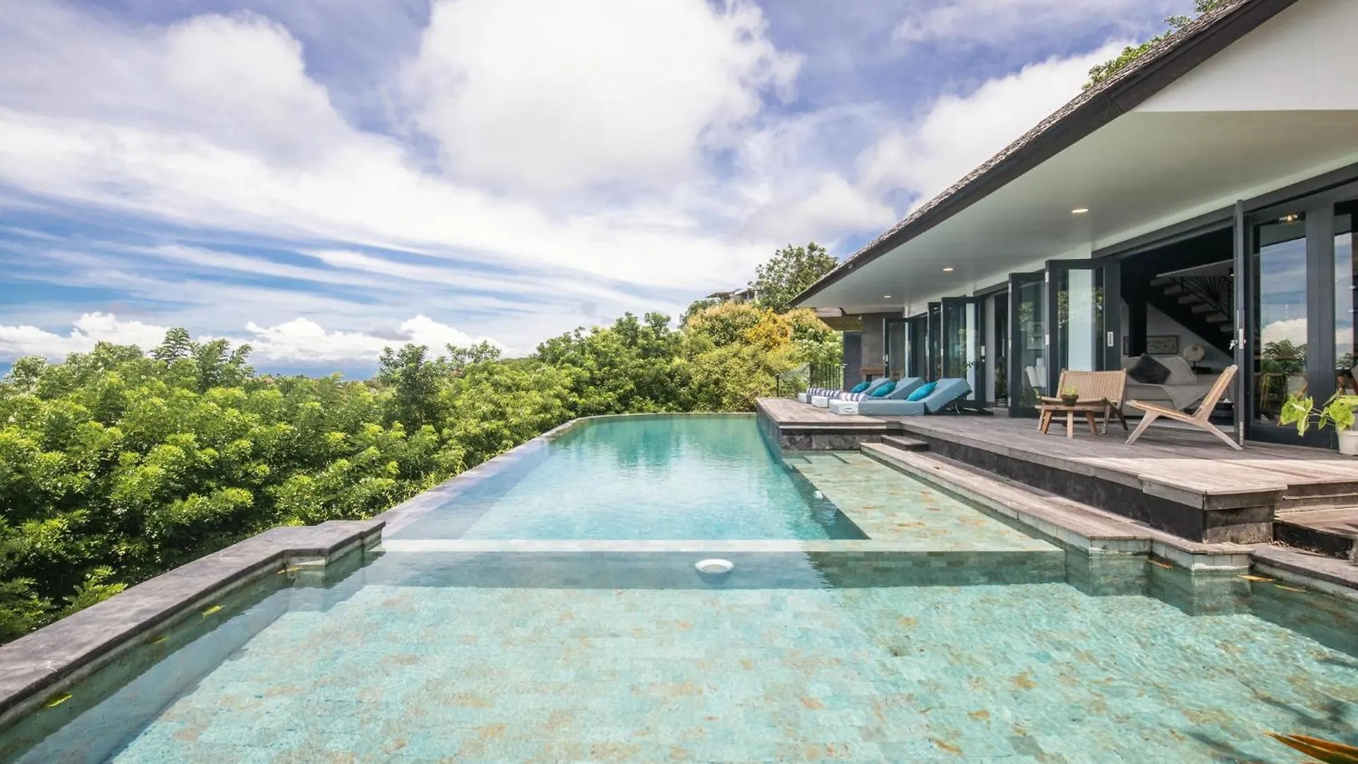 The 6-bathroom villa is located in the Pecatu district of Uluwatu, 1.9 miles from New Kuta Golf.